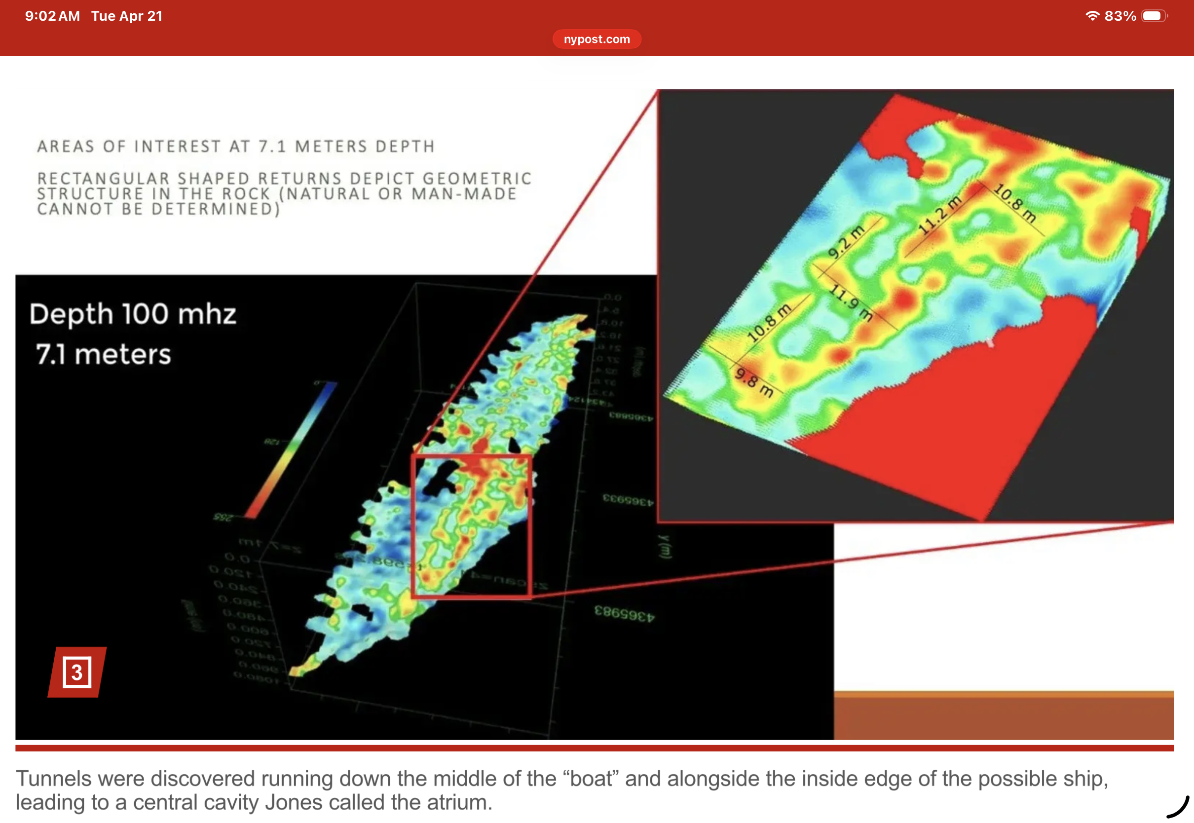 Tunnels were discovered running down the middle of the “boat” and alongside the inside edge of the possible ship, leading to a central cavity Jones called the atrium.
