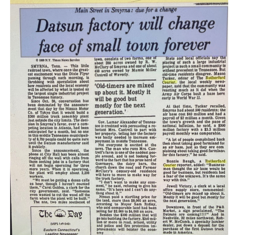 My late mother once reminded me of something I told her years ago: “Our small town is going to change when the Datsun plant opens.”