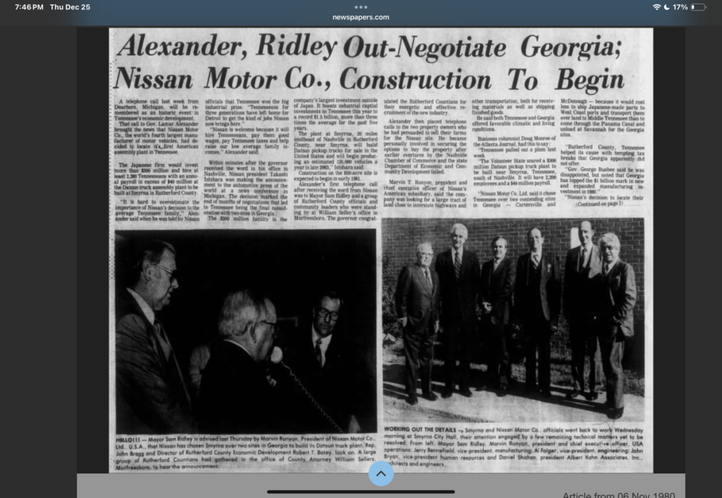 Yet the beginning wasn’t smooth. The groundbreaking for Nissan’s Smyrna plant in 1981 was meant to signal economic progress but instead highlighted deep labor tensions. Union supporters jeered Gov. Lamar Alexander as he was escorted by state troopers through a crowd of about 1,000 protesters who shouted insults at Nissan executives planning a $300 million investment and 2,000 jobs at the company’s first U.S. plant. Alexander later said he was shocked by the crowd’s rudeness. The protest, reported by Kentucky’s Daily News on February 4, 1981, stemmed from Nissan’s use of a South Carolina contractor employing some non-union labor, underscoring the clash between traditional labor disputes and the realities of global manufacturing.